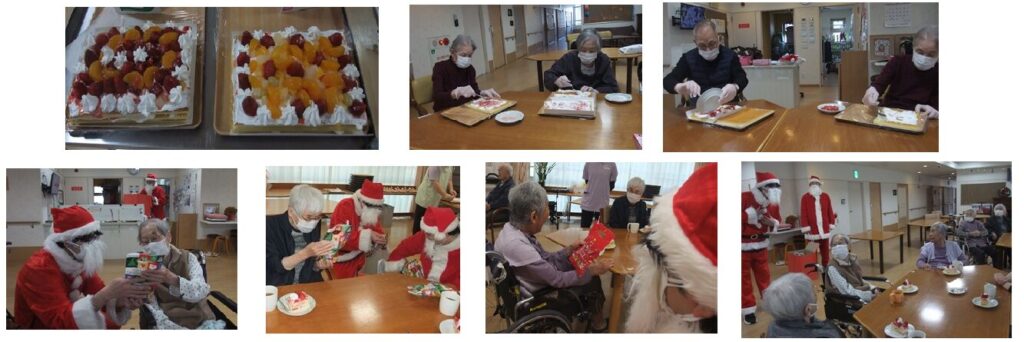 スタッフブログ 2025/12/18 手作りケーキでクリスマス会 16日のレクレーションでクリスマスケーキ作りを行いました。 皆様の個性が光る華やかなケーキができあがり、みんなで賑やかにいただきました。 そのあとサンタクロースが登場しプレゼント! 一足早いクリスマスの雰囲気を楽しみ、たくさんの笑顔があふれる素敵な時間になりました。