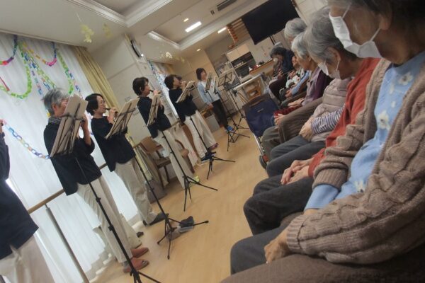 演奏はボランティアの皆様によるオカリナの生演奏。 やわらかく澄んだ音色が会場内に響きわたり、入居者の皆様も手拍子や歌で参加される場面もありました。 「久しぶりに童謡を口ずさめて楽しかった」とのお声も聞かれ、大盛況でした。